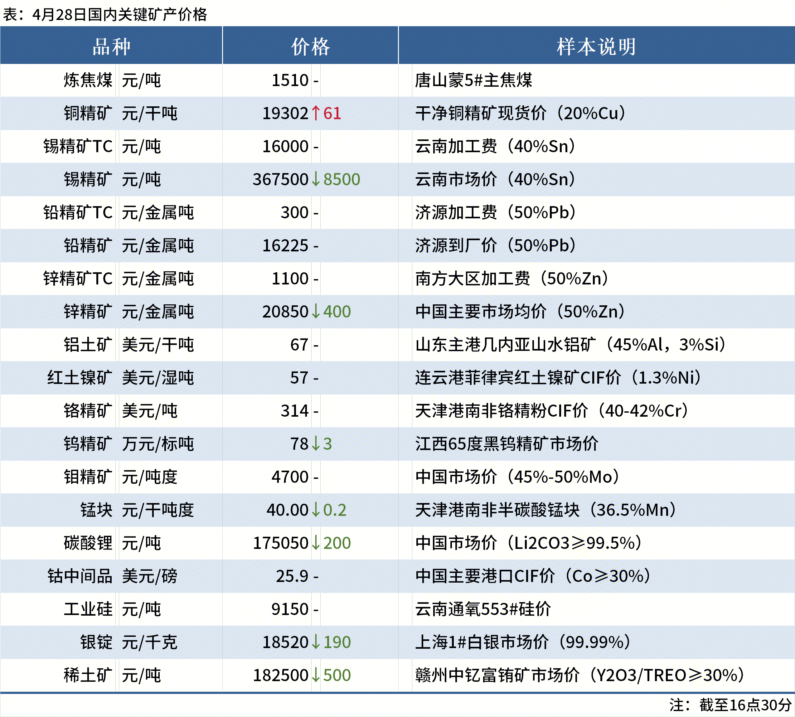 ◎4月28日,山东港口进口铁矿(15:25)价格较上一工作日小幅下跌,累计下跌2-5。目前60.8%PB粉主流在765-770;超特粉主流在650-655;麦克粉主流在760-765。(单位:元/湿吨)